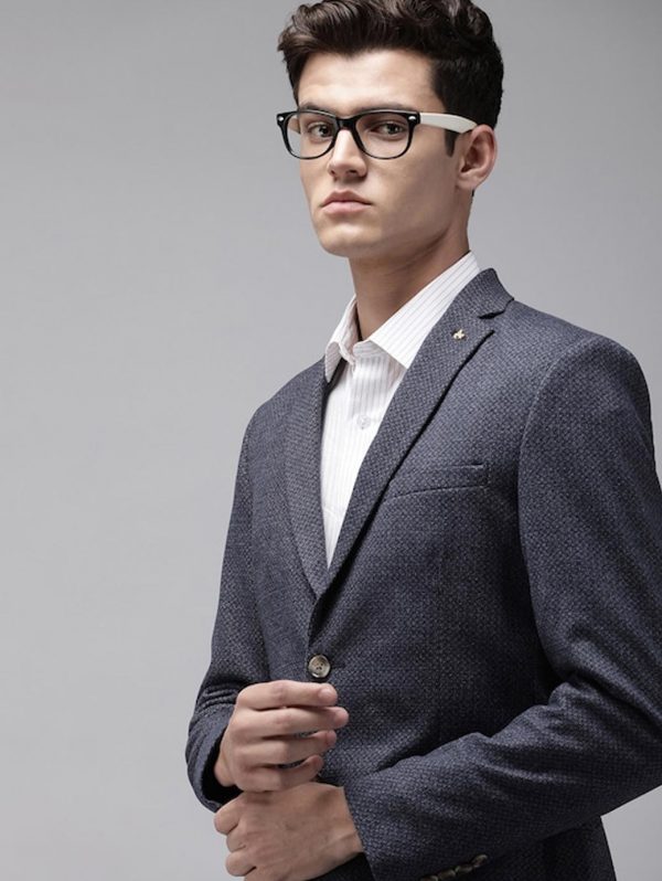 Men Navy Blue Self Design Slim Fit Single-Breasted Smart Casual Blazer