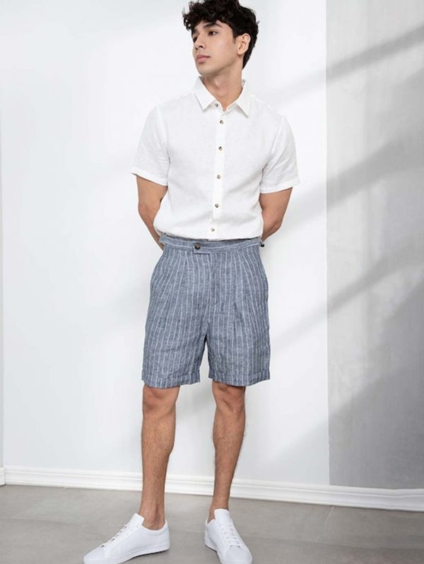 Men Grey Striped Linen Slim Fit Pleated Shorts