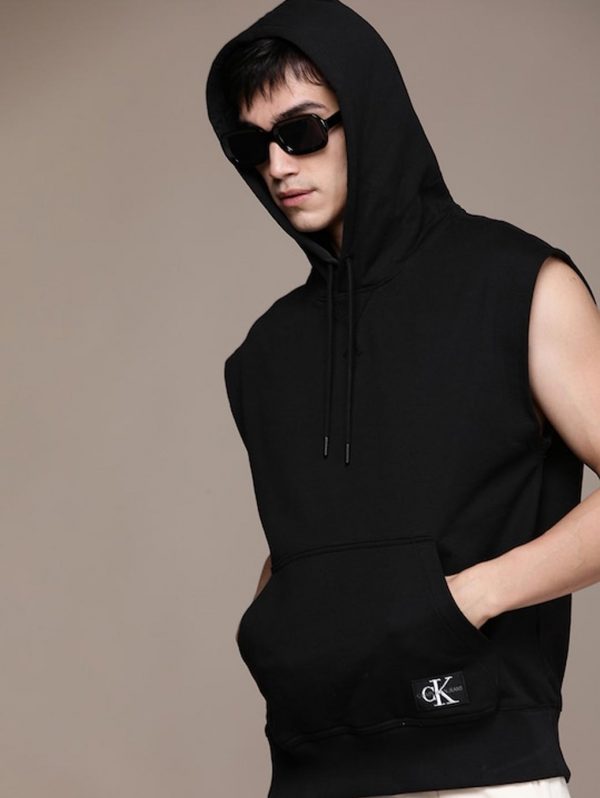 Men Black Solid Sleeveless Hooded Sweatshirt