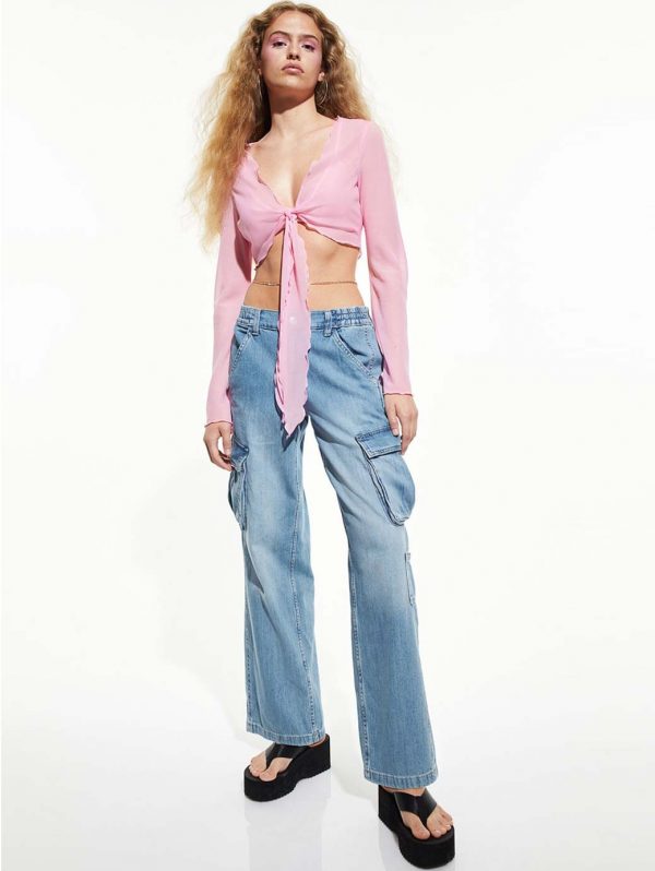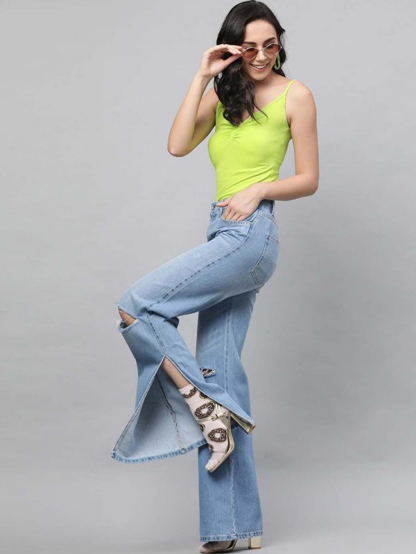 "Women Blue Flared Mid-Rise Slash Knee Stretchable Jeans "