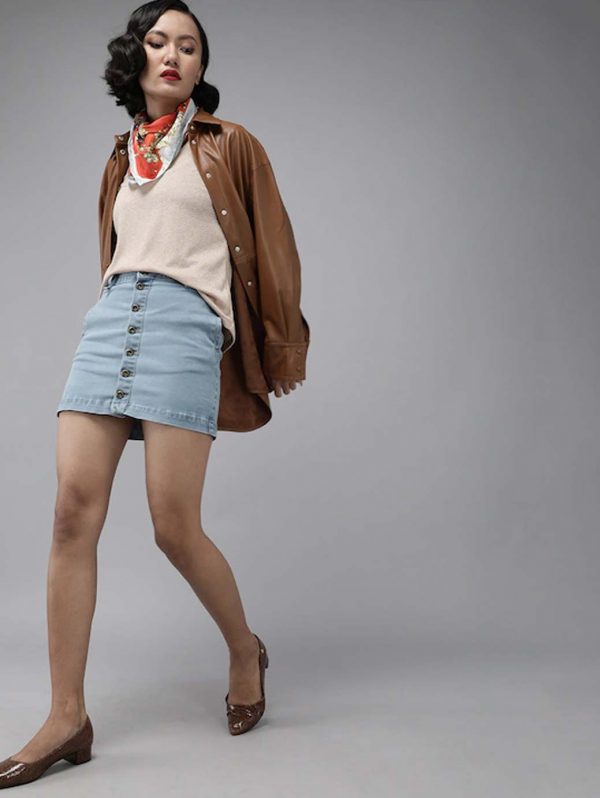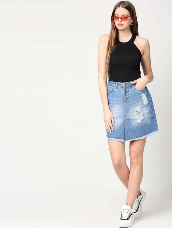 Women Blue Solid Distressed A-Line Mini Denim Skirt