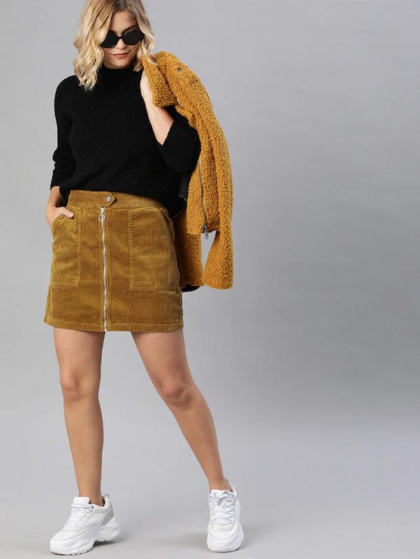 Women Beige Solid Corduroy A-Line Pure Cotton Skirt
