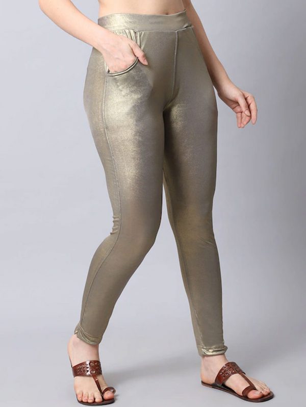 Women Gold Coloured Solid Shimmer Churidar Length Leggings