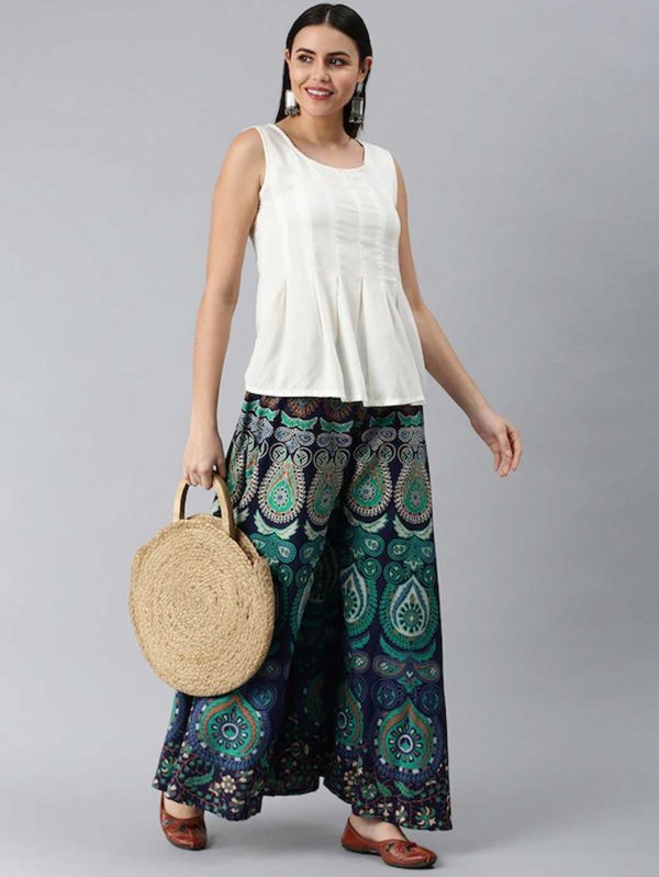 Women Green & Navy Blue Ethnic Motifs Print Flared Palazzos
