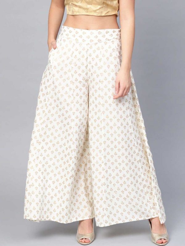 Women Off-White & Golden Printed Flared Palazzos