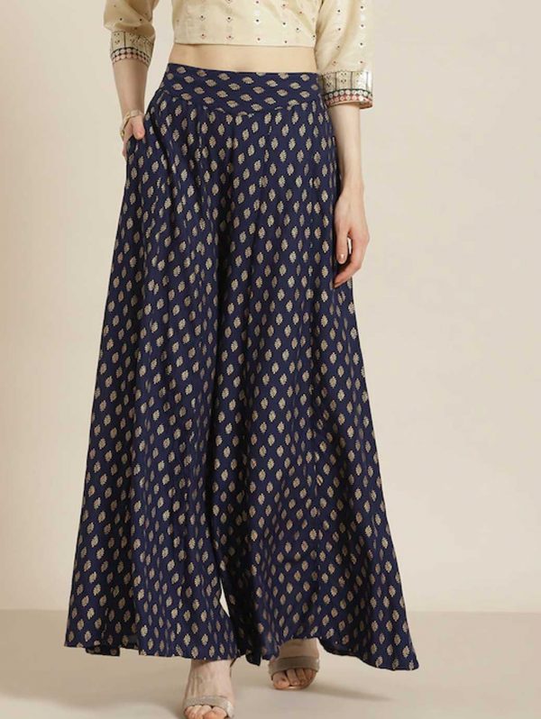 Women Navy Blue & Golden Ethnic Motifs Printed Flared Palazzos
