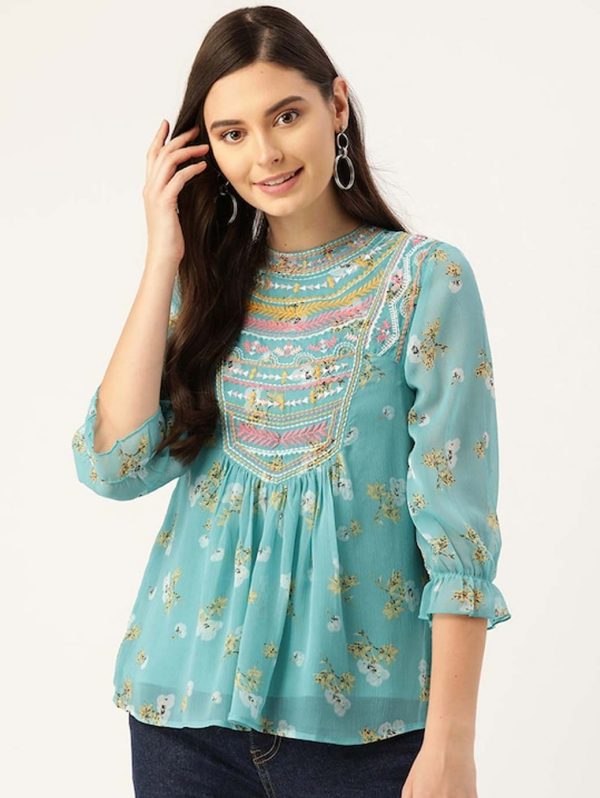 Women Blue & Yellow Floral Print A-Line Top