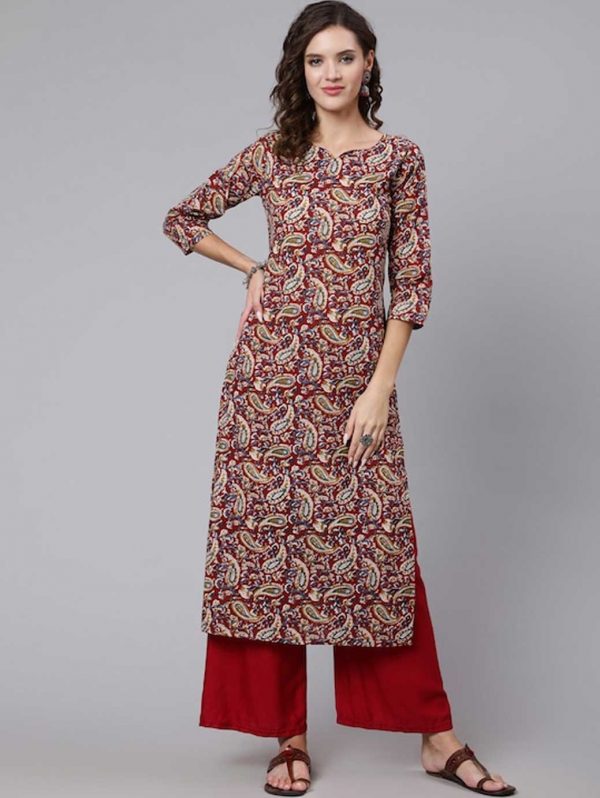 Women Maroon And Blue Paisley Printed Cotton Kurta