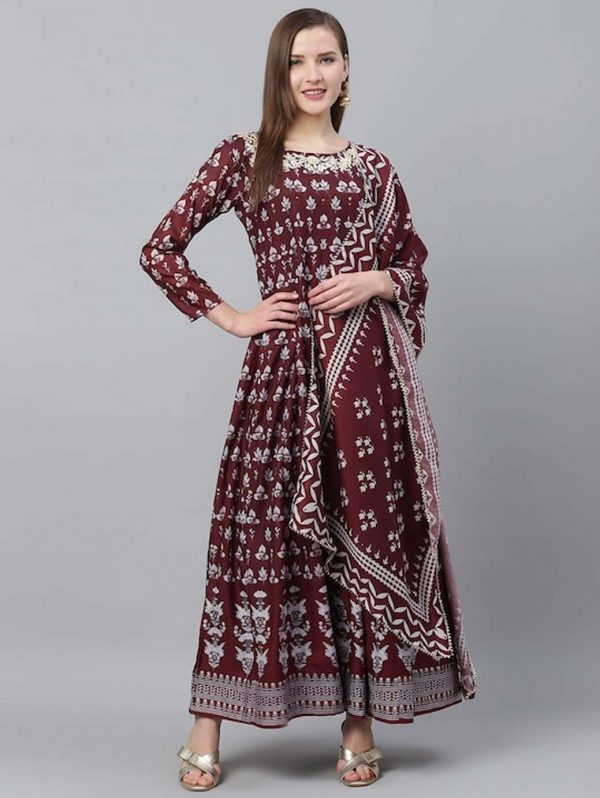 Women Coffee Brown & Off-White Floral Block Printed Anarkali Kurta with Dupatta