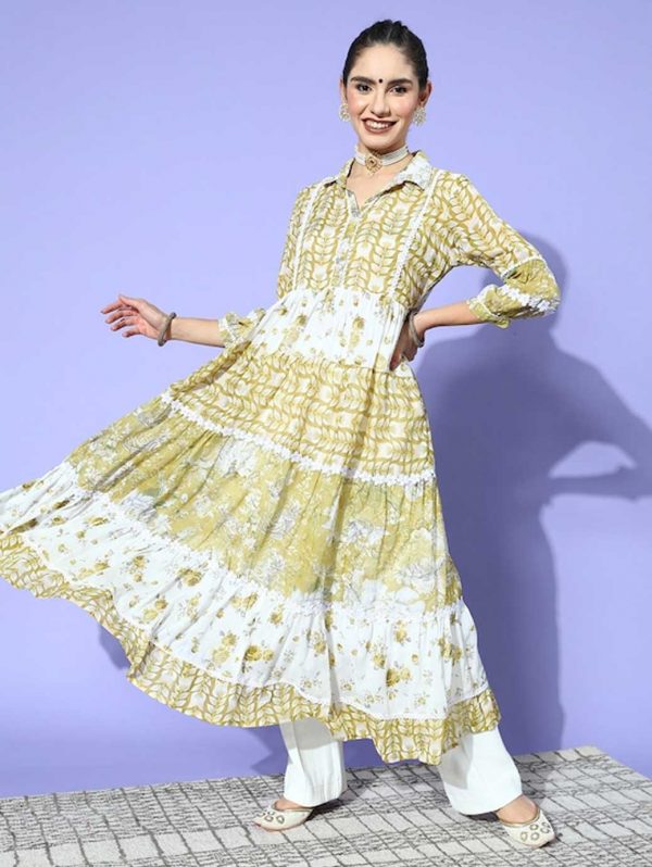 Women Elegant Olive Cotton Swirling Volume Kurta
