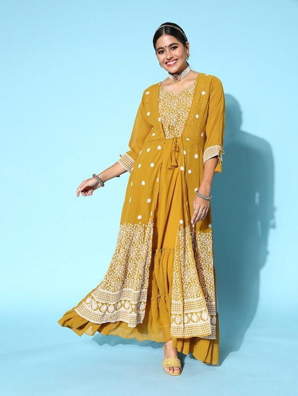 Women Bright Mustard Yellow Georgette Sequins Embroidery Party Wear Gown