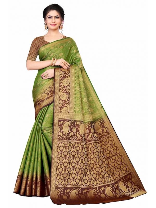 Olive Green & Brown Woven Design Zari Pure Silk Kanjeevaram Saree