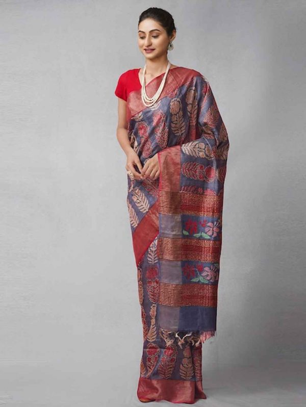 Maroon & Blue Woven Design Kantha Work Pure Silk Tussar Saree