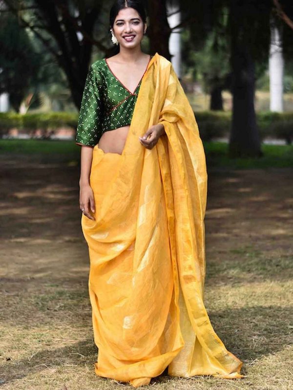 Yellow & Gold-Toned Woven Design Zari Pure Linen Saree
