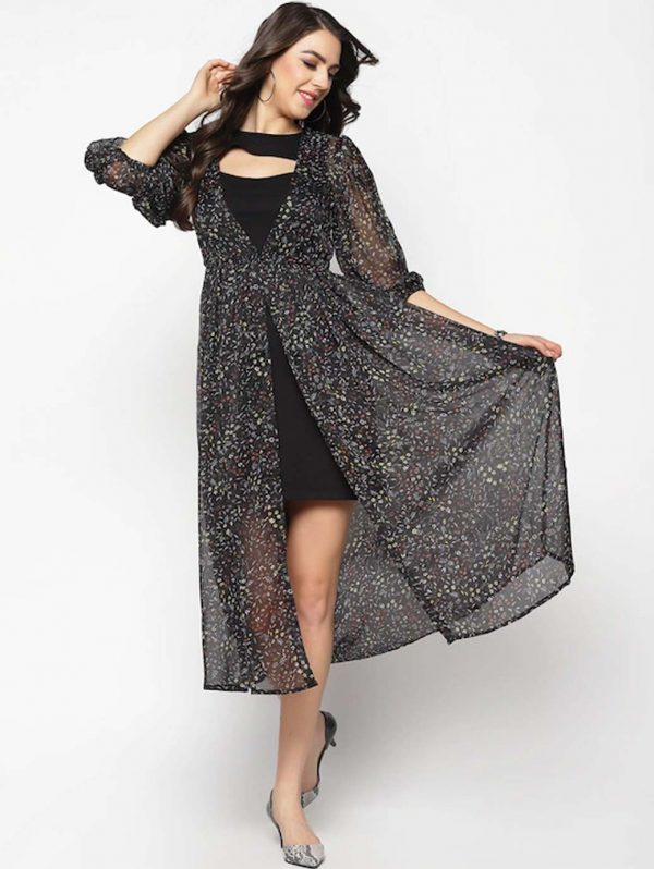 Women Black & Grey Printed Button Shrug