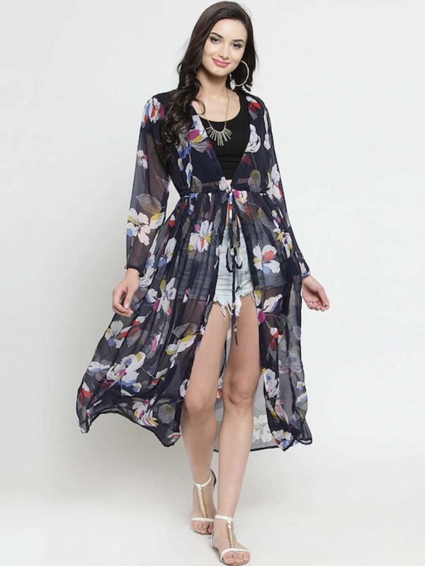 Navy Blue & White Printed Tie-Up Shrug