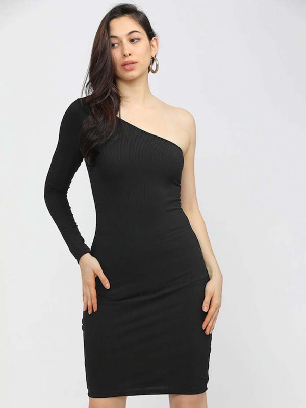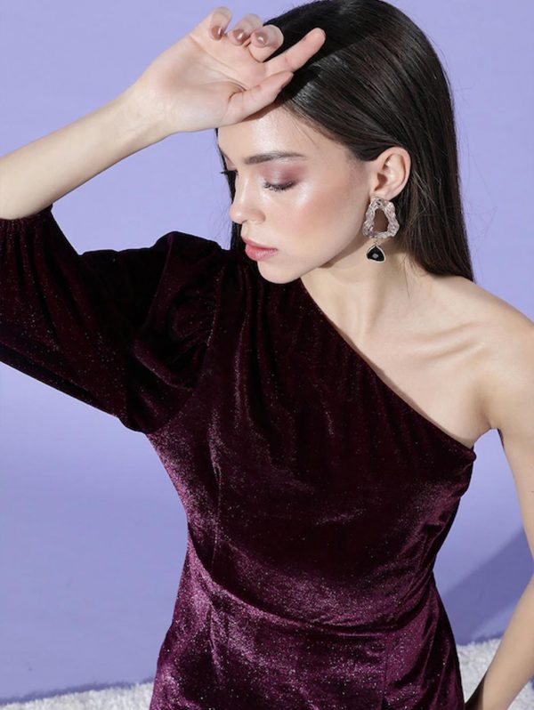 Women Deep Burgundy Solid One-Shoulder Dress