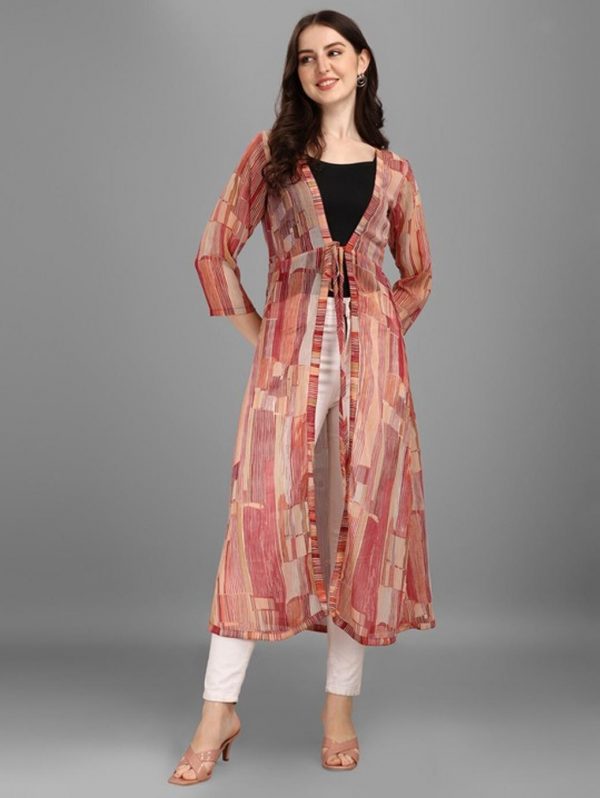 Women Brown Printed Longline Tie-Up Shrug
