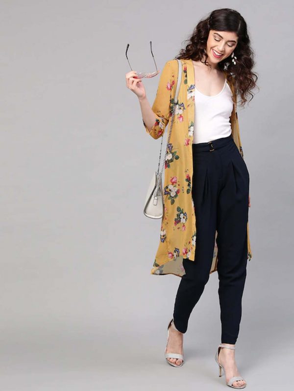 Mustard Yellow & Pink Floral Print Open Front Shrug