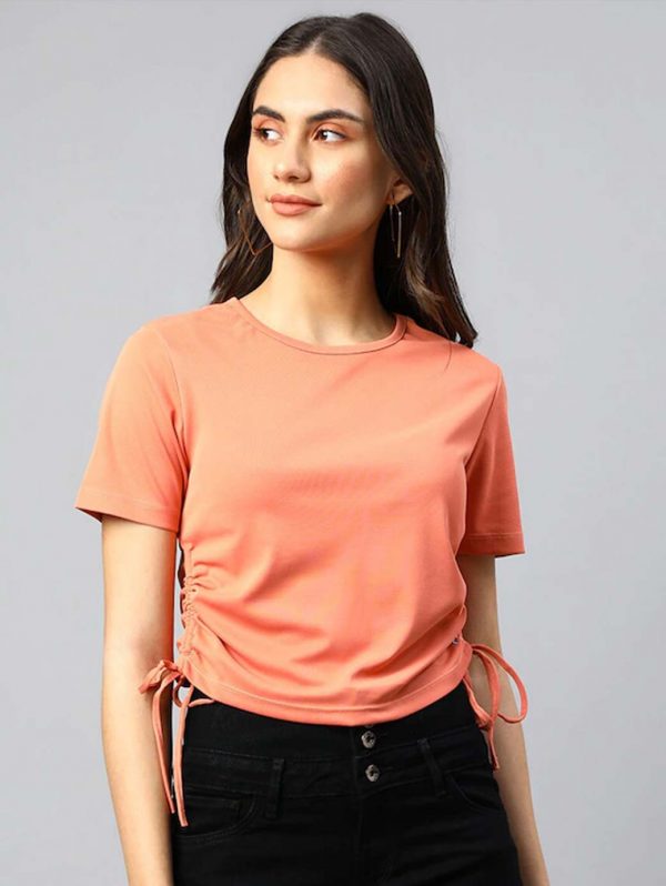 Peach Solid Round Neck Crop Side Tie Ups Top
