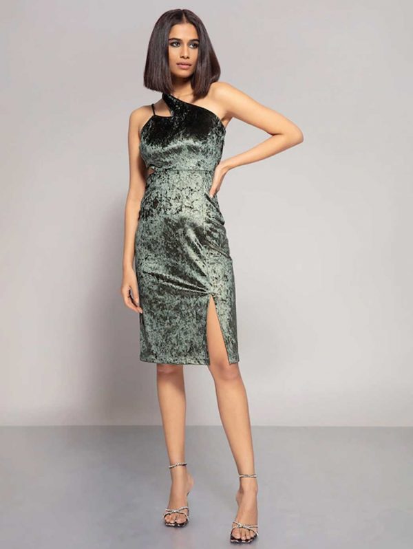 Green Embellished Velvet One Shoulder Sheath Dress