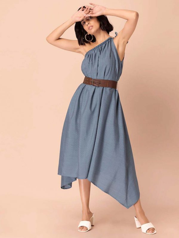 Blue One Shoulder Dress with Leather Belt