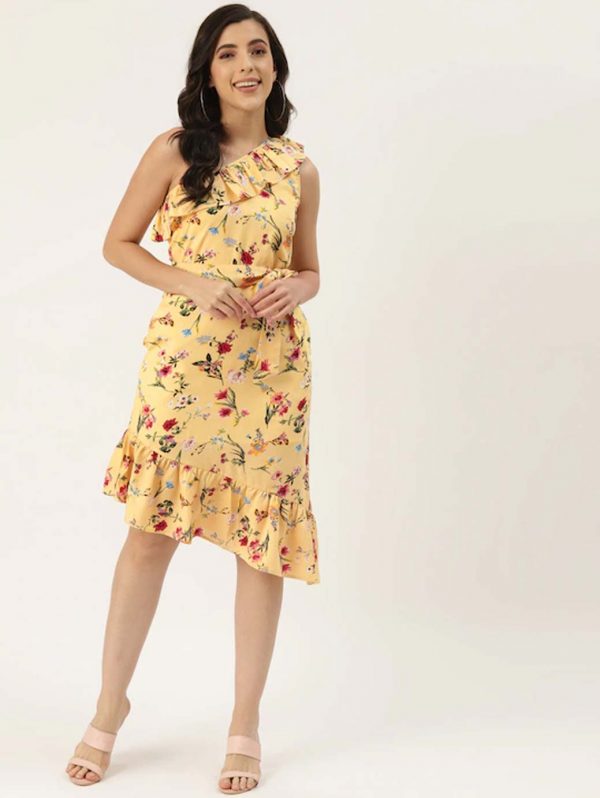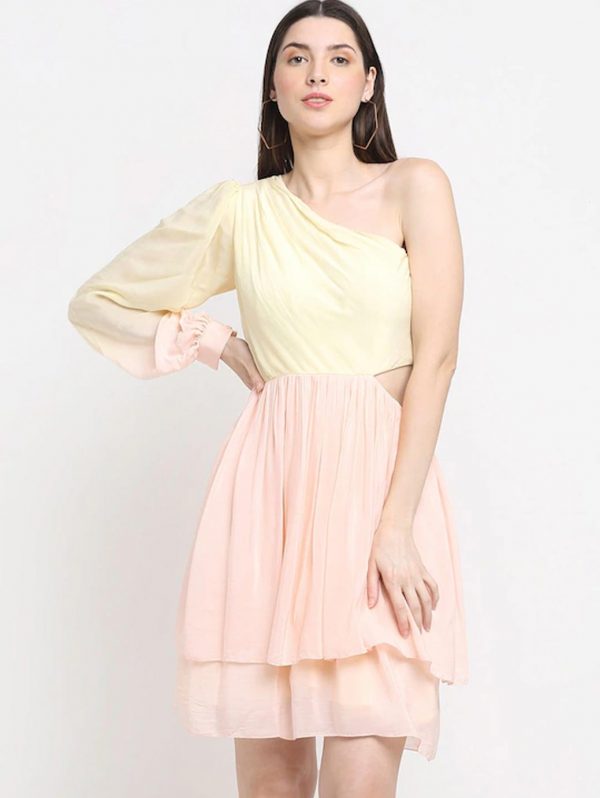 Pink & Yellow One Shoulder Crepe Dress