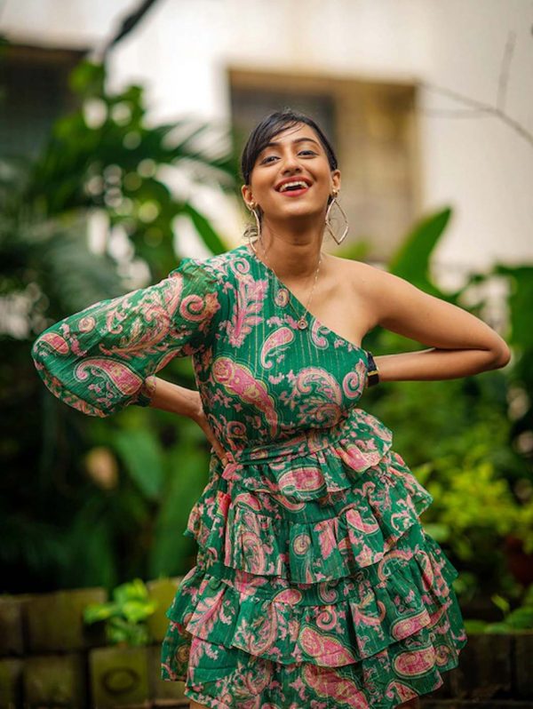 Green & Pink Floral One Shoulder Chiffon Dress