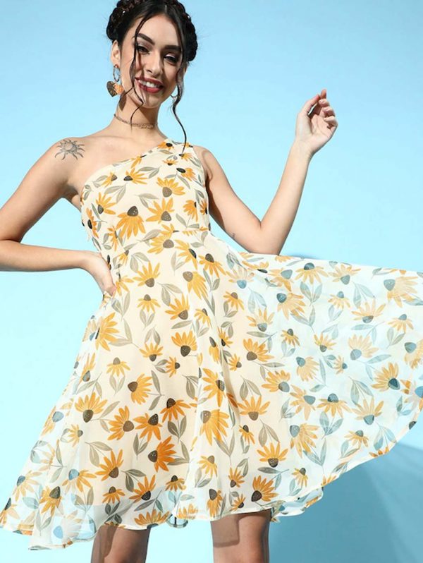 Yellow & White Floral One Shoulder Dress