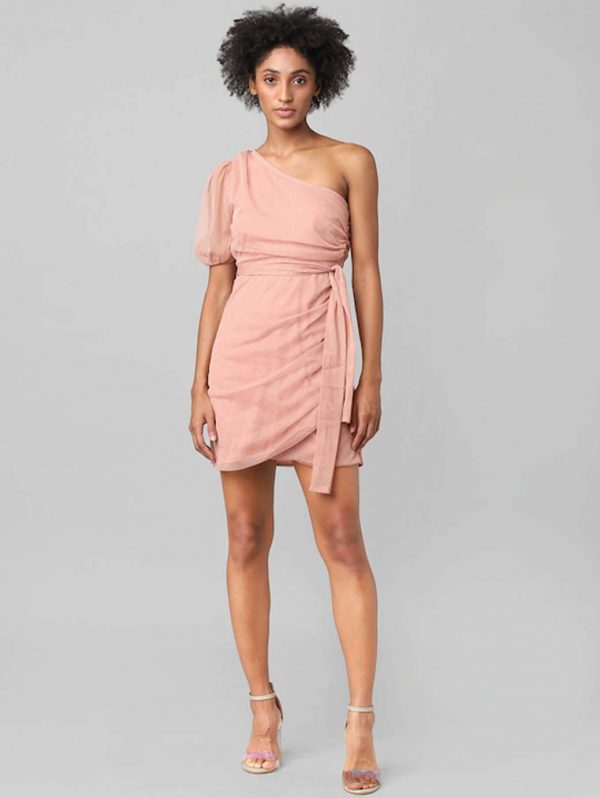 Women Pink Solid One Shoulder Mini Sheath Dress