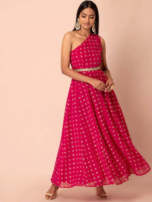 Women Pink One Shoulder Belted Ethnic Dress
