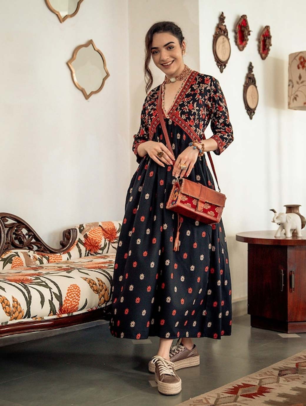 Black and Orange printed woven maxi dress, has a V-neck, three-quarter sleeves, and flared hem