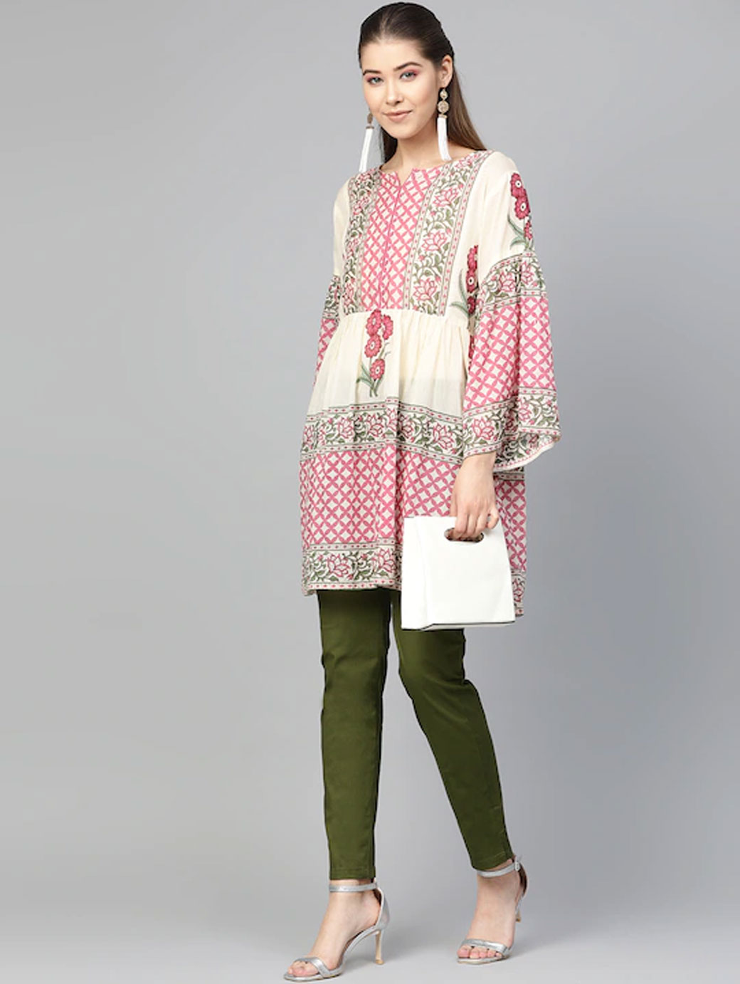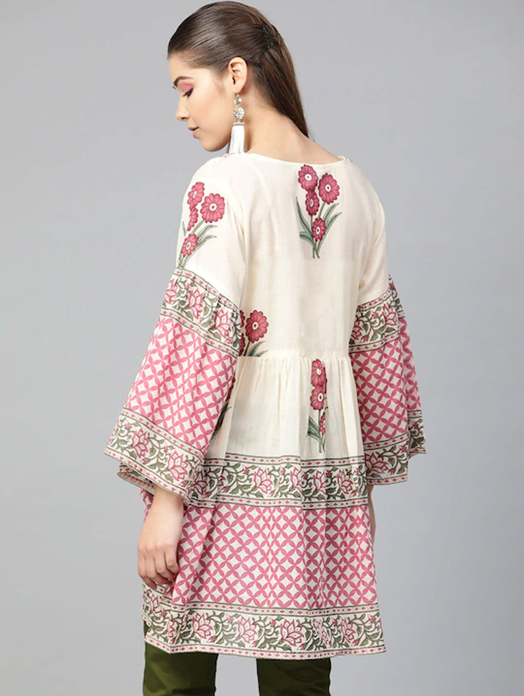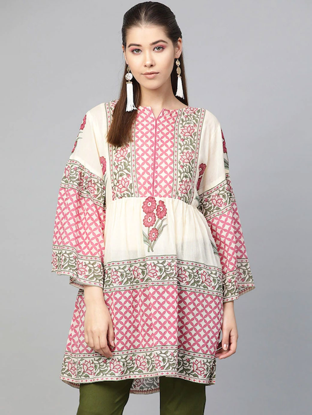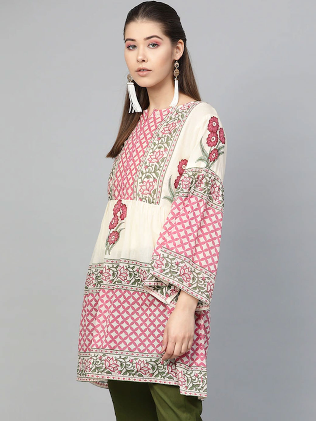 Beige and Pink printed Tunic, has a round neck, long sleeves, and Gathers detail.