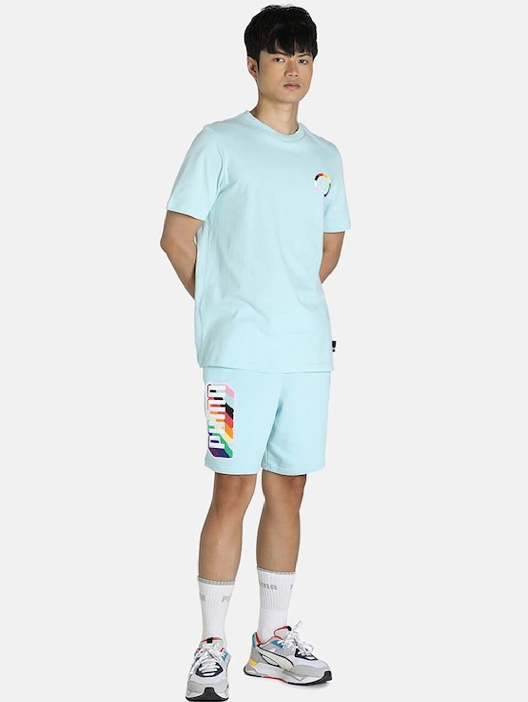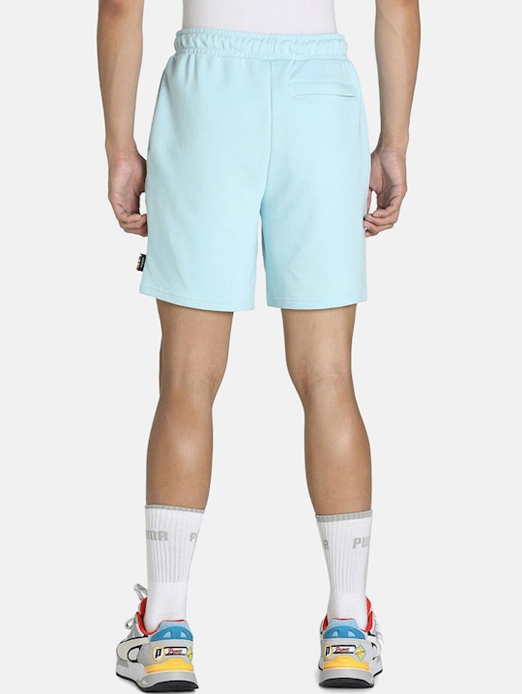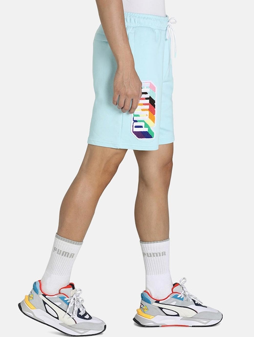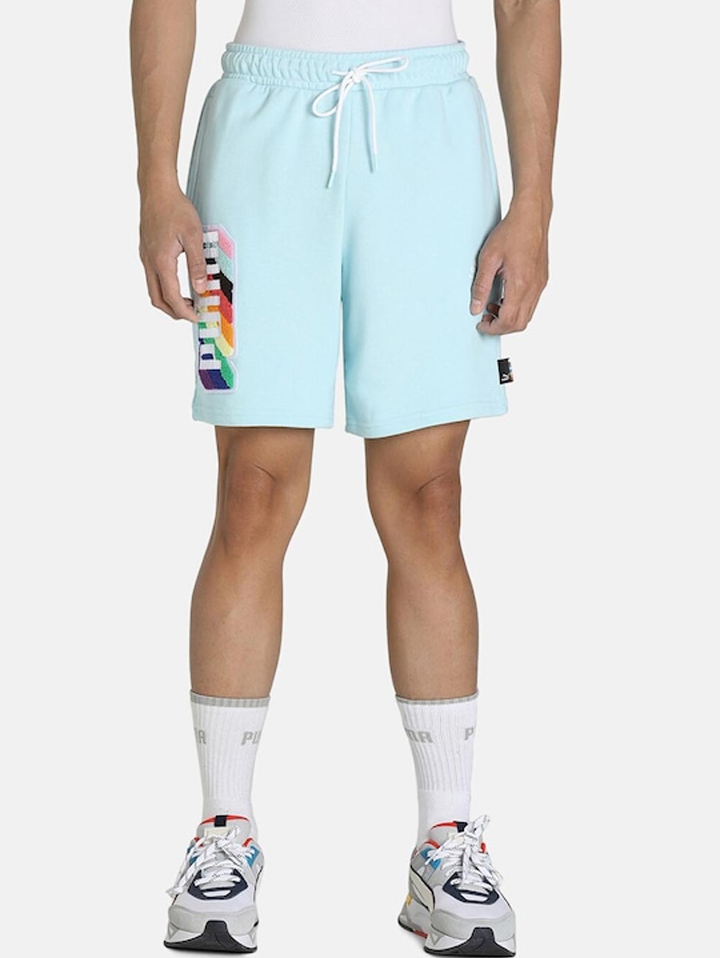 Blue graphic printed mid-rise training or gym sports shorts, has 3 pockets, drawstring closure