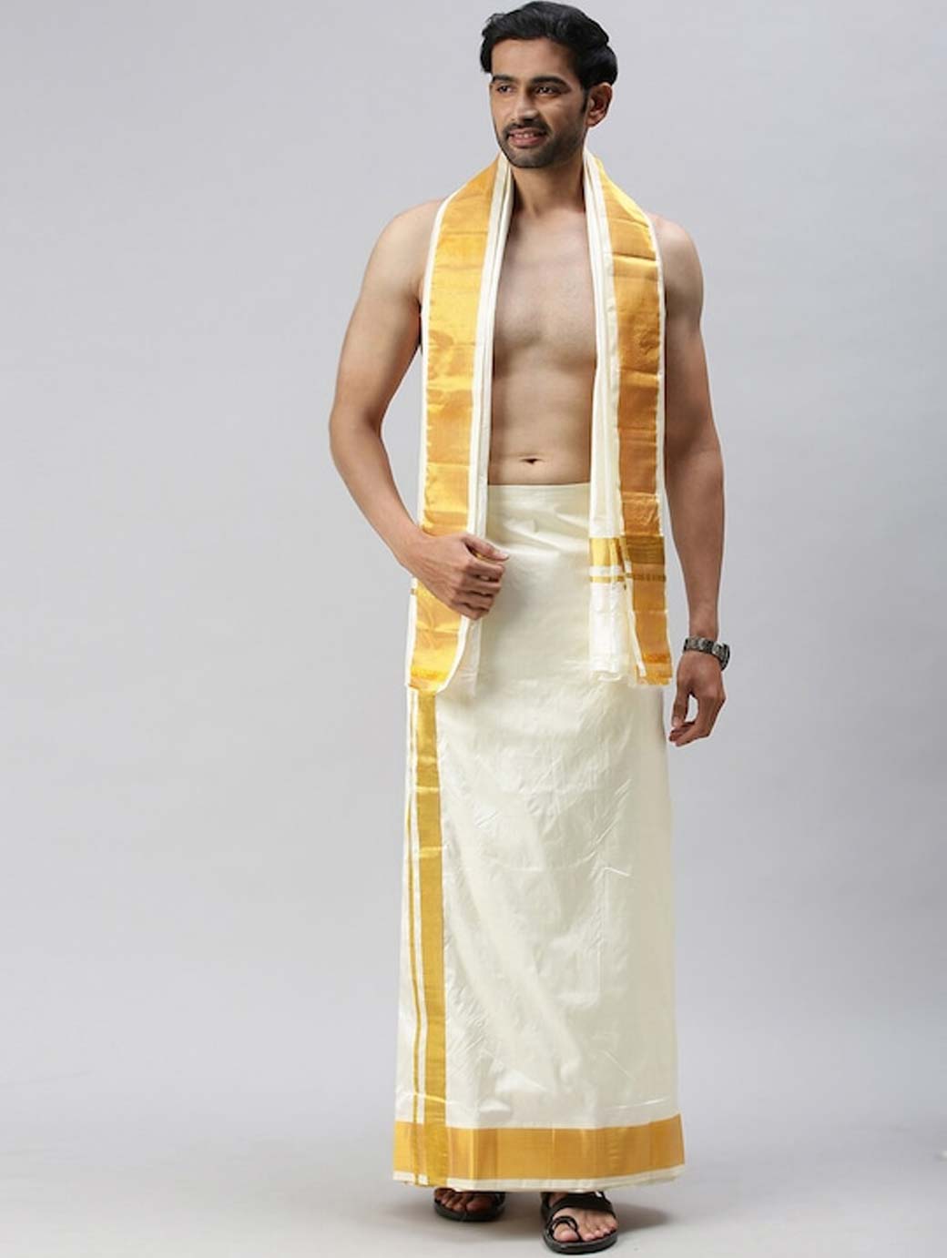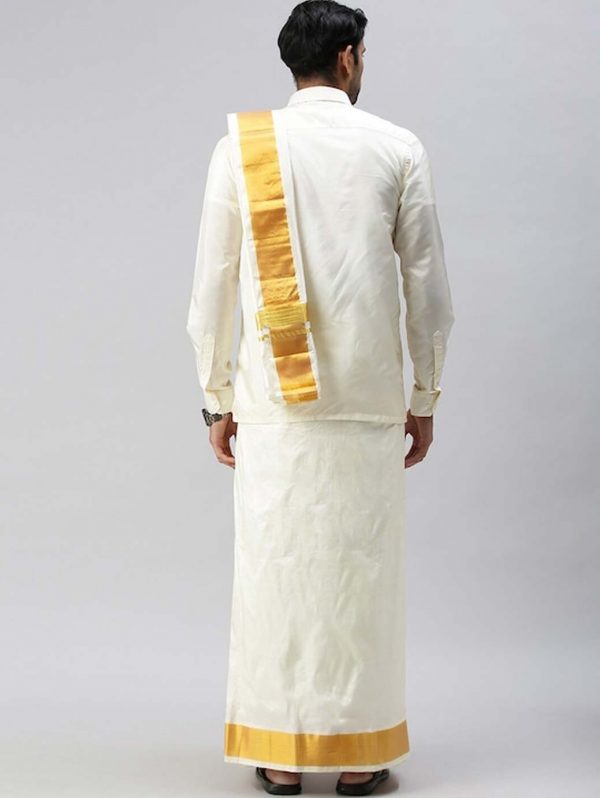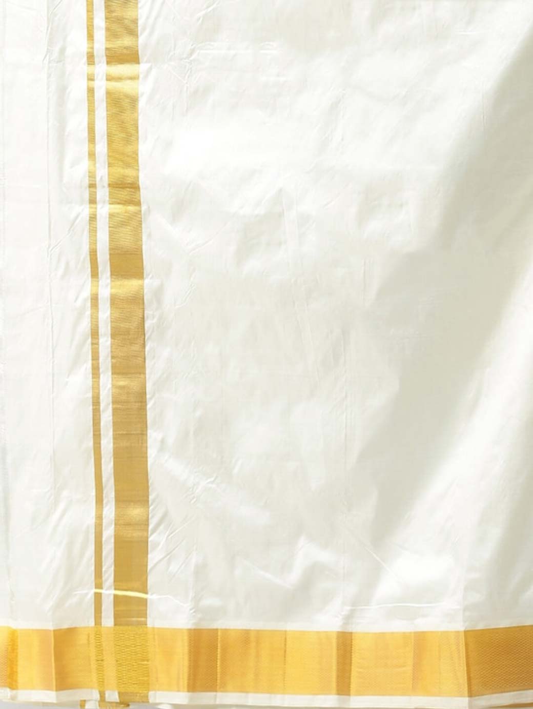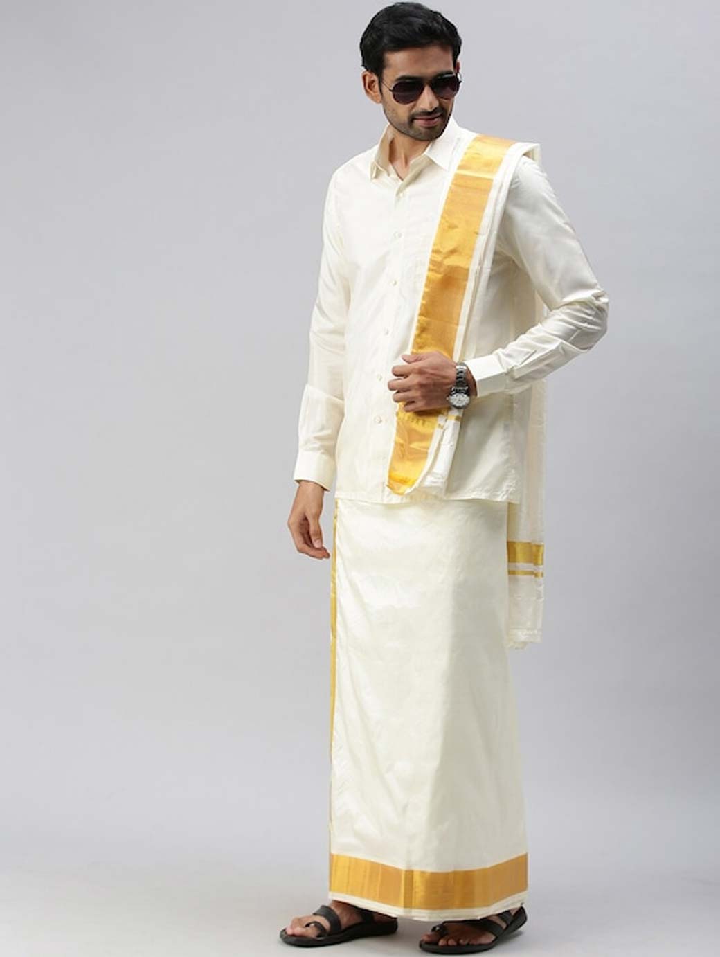 Men Cream-Coloured Solid Pure Silk Dhoti & Towel