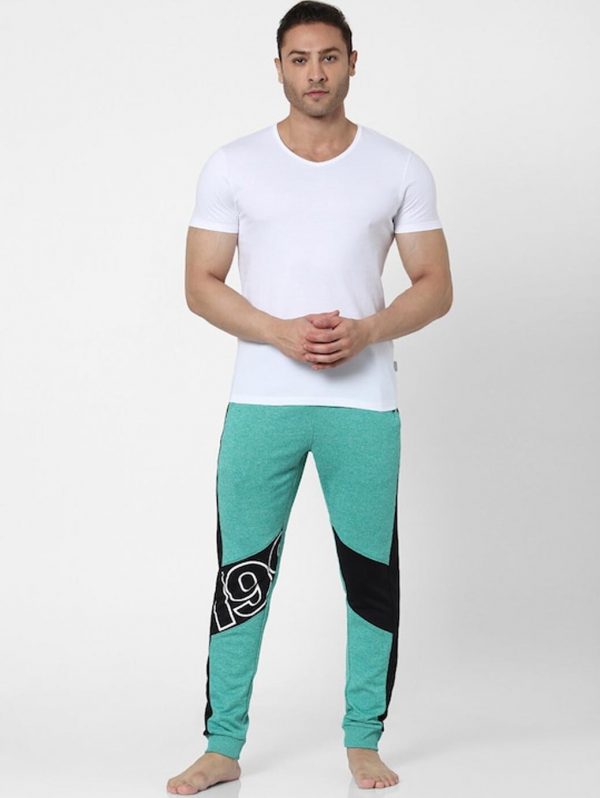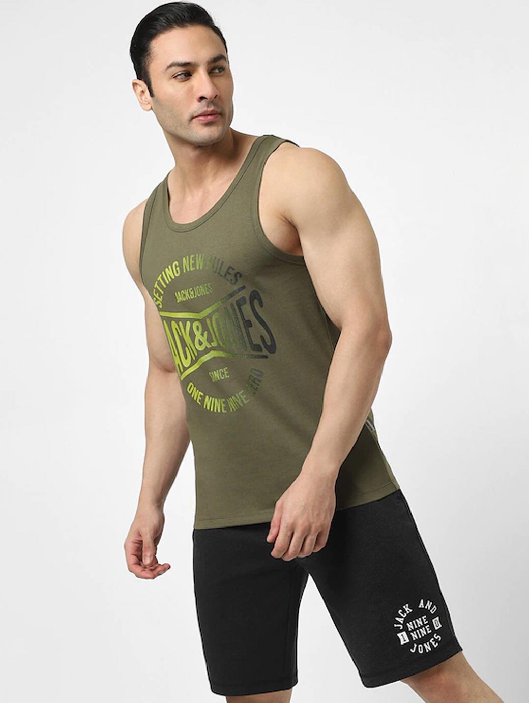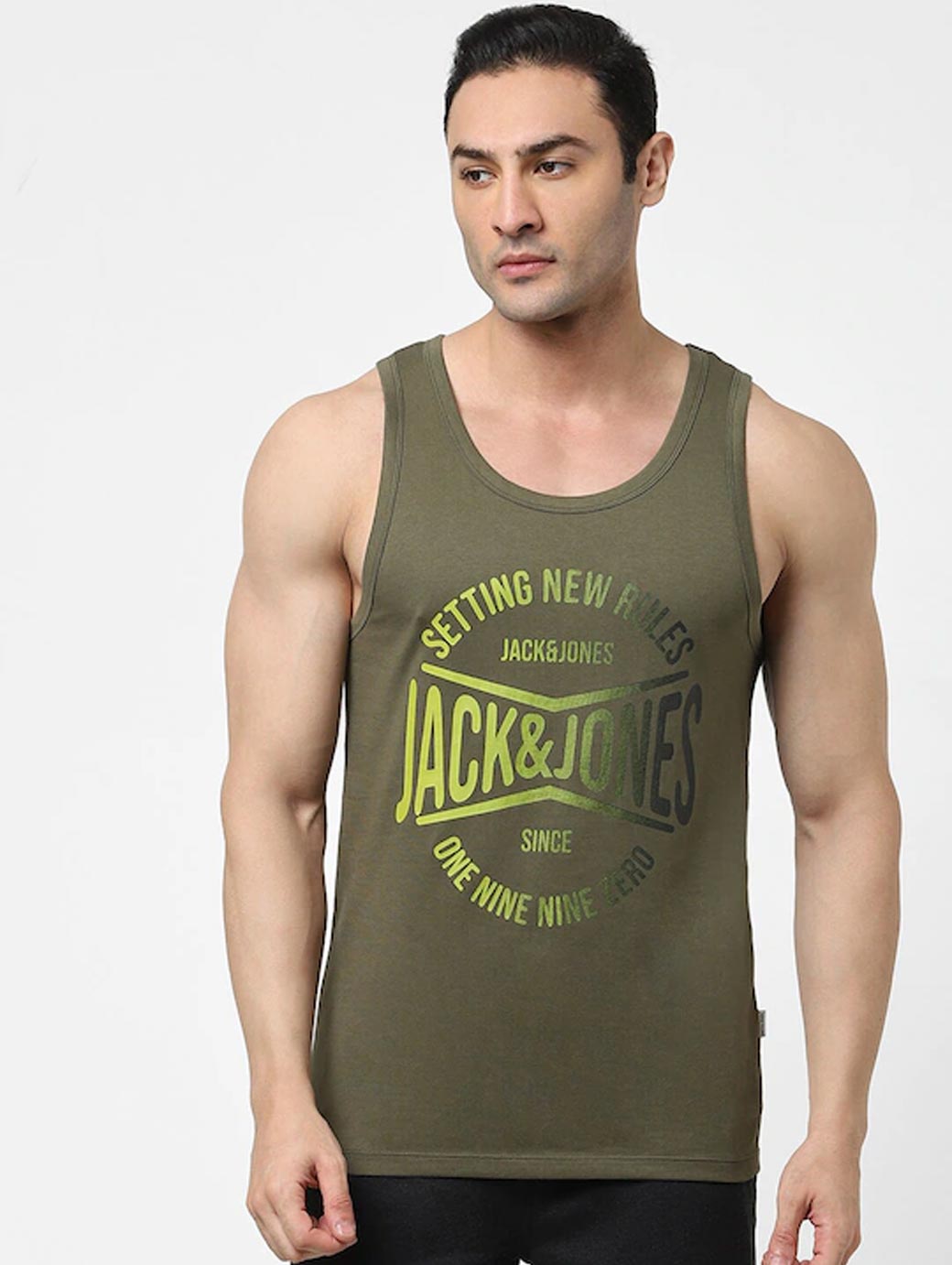 Green printed innerwear gym vest, has a round neck, sleeveless