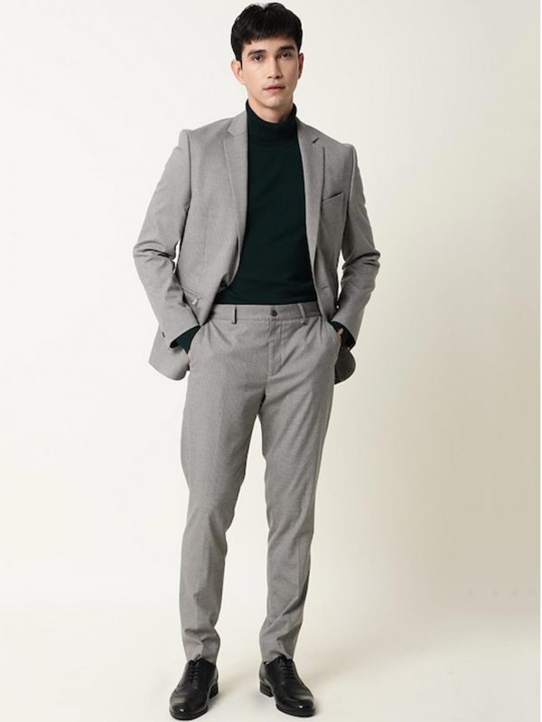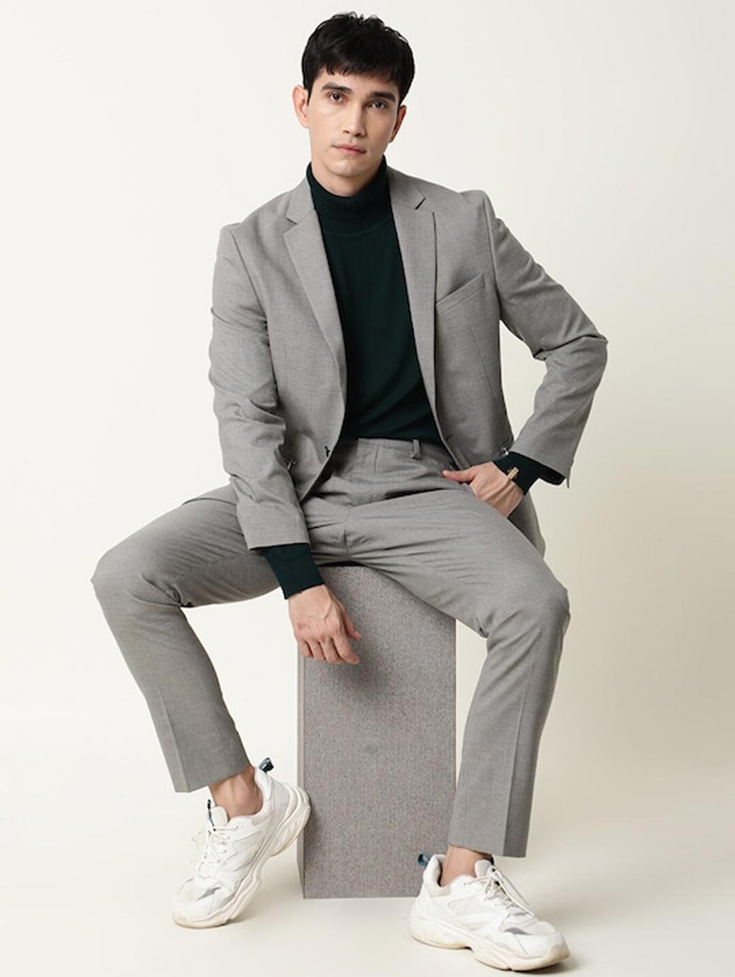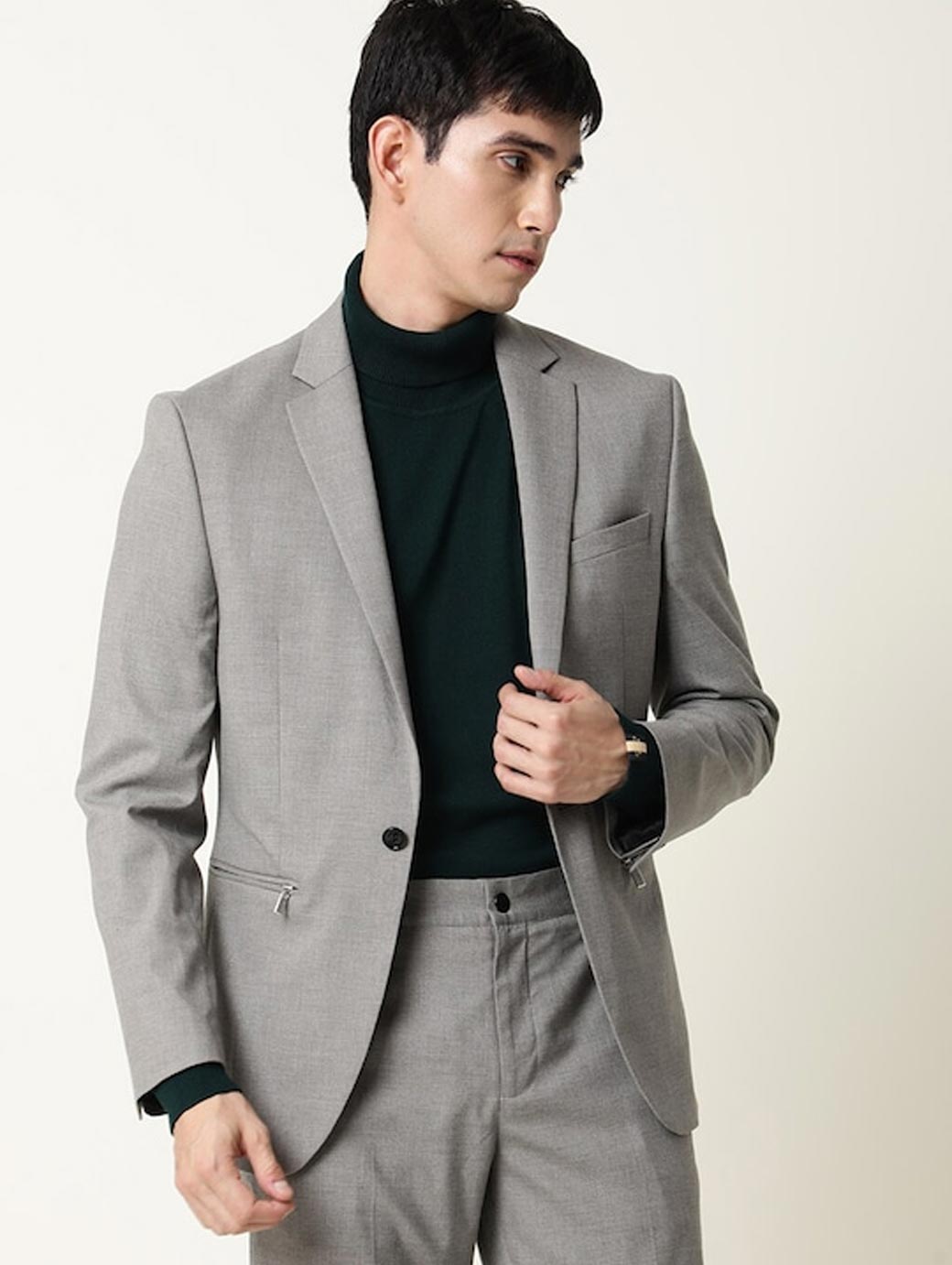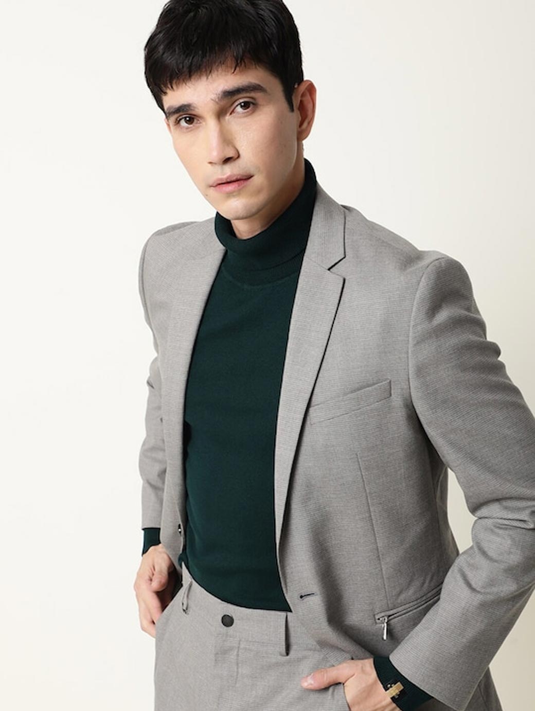 Grey solid slim-fit single-breasted blazer, has a notched lapel collar, long sleeves, button closure, a welt pocket, 2 flap pockets, double-vented back hem