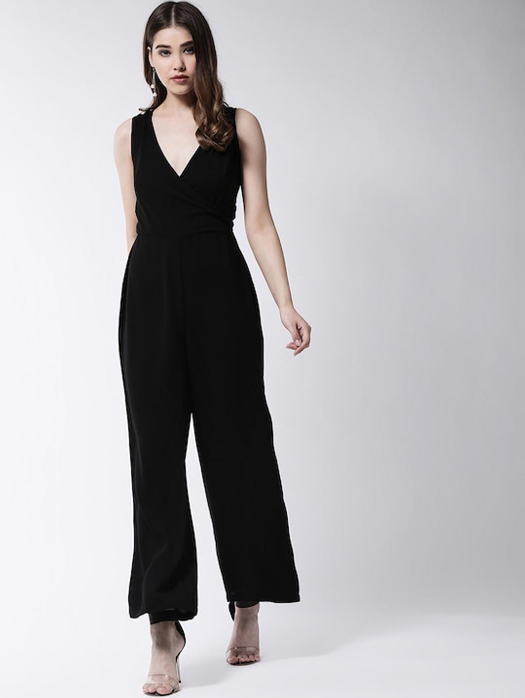 Black solid basic jumpsuit, has a V-neck, sleeveless, concealed zip closure