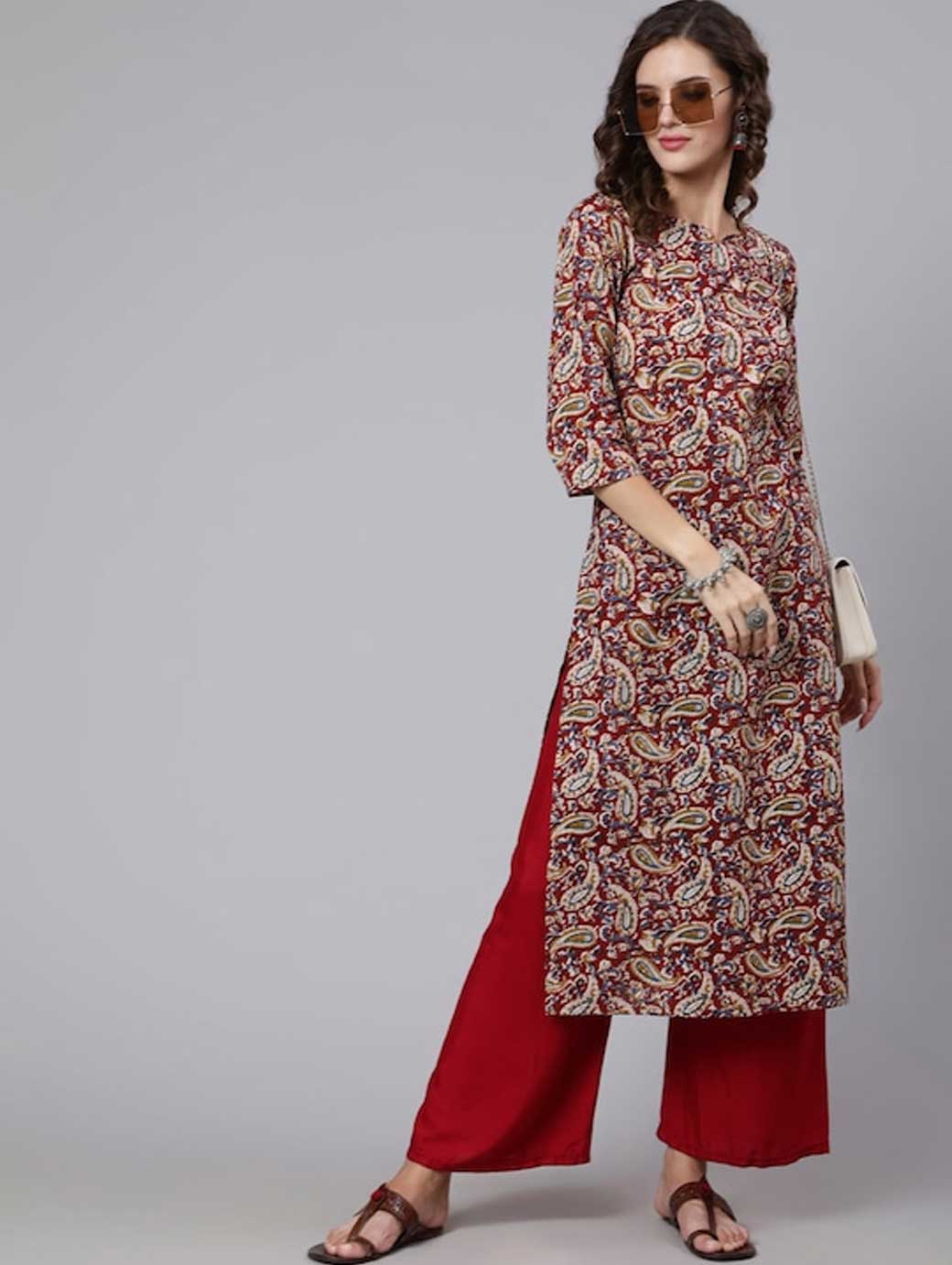 Colour: maroon, blue and beige Paisley printed Round neck Three-quarter, regular sleeves Straight shape Calf length with straight hem Machine weave regular cotton