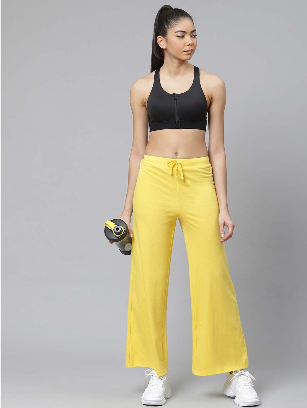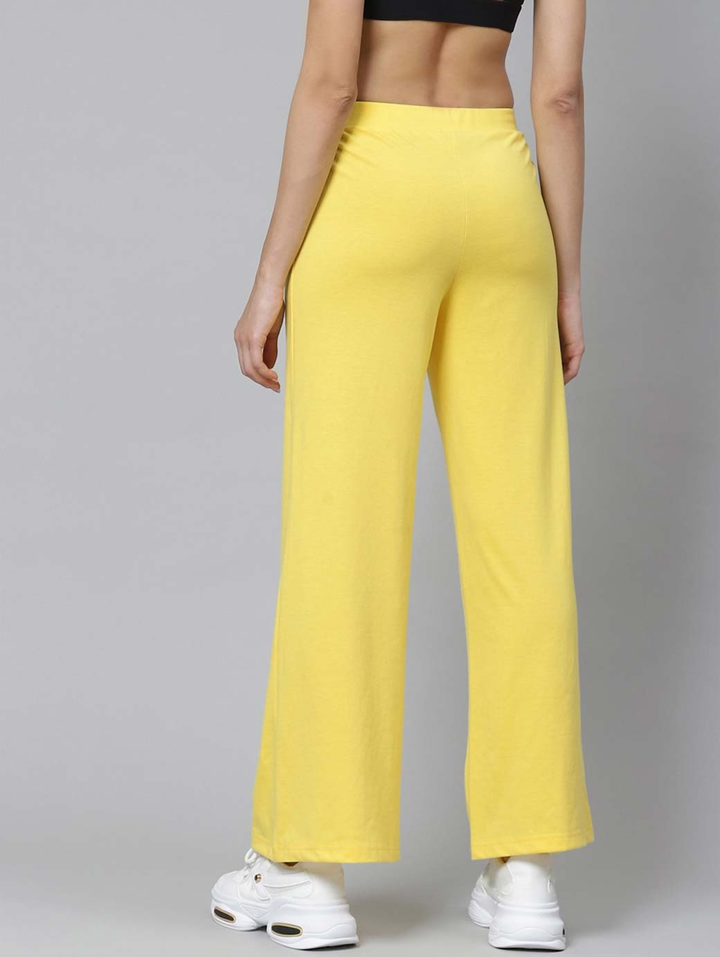 A pair of yellow solid knitted mid-rise track pants, has an elasticated waistband with drawstring fastening